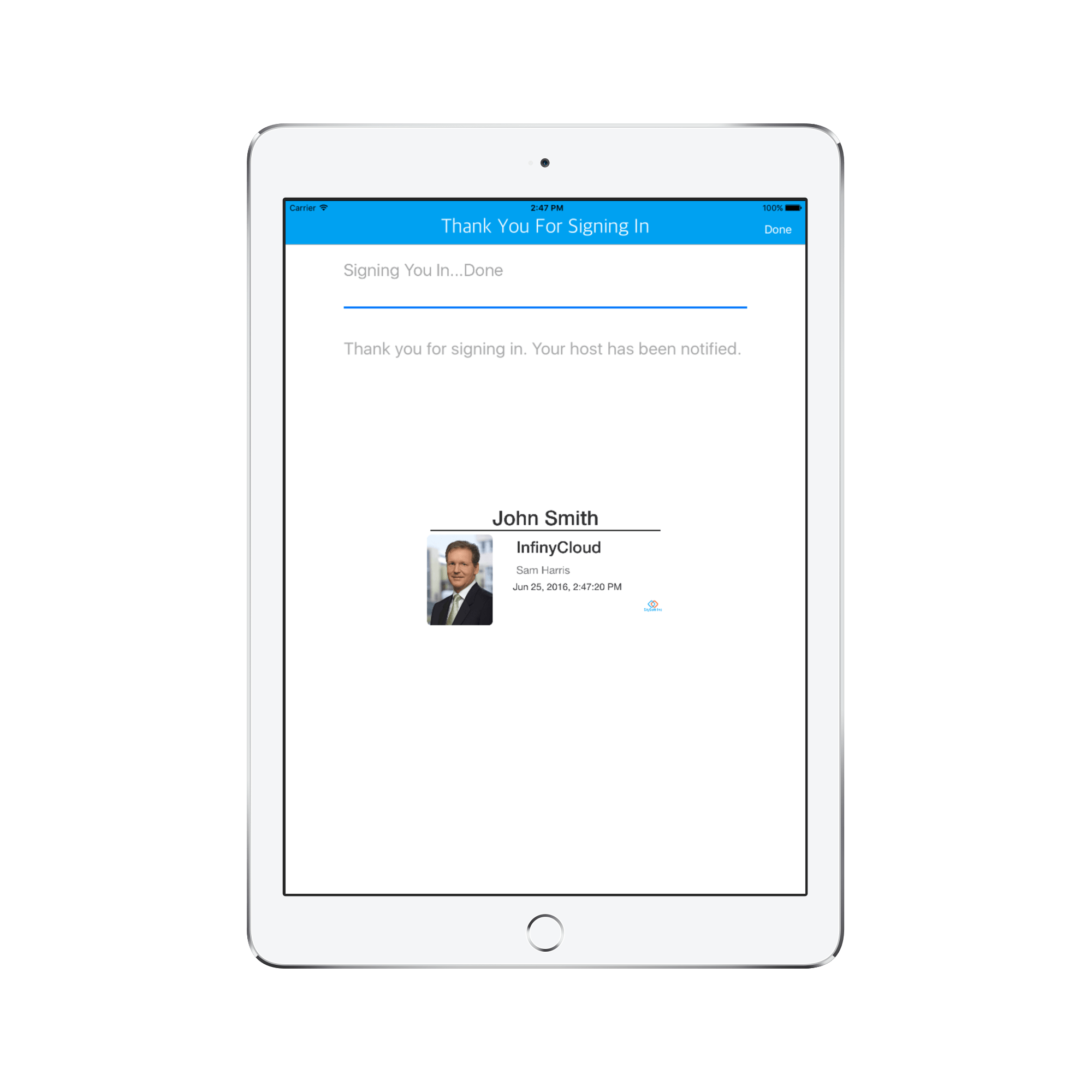 InstaCheckin can automatically print visitor badges as soon as the visitors check in. You can customize the contents of the badge and even add custom messages to feel your guests welcomed.